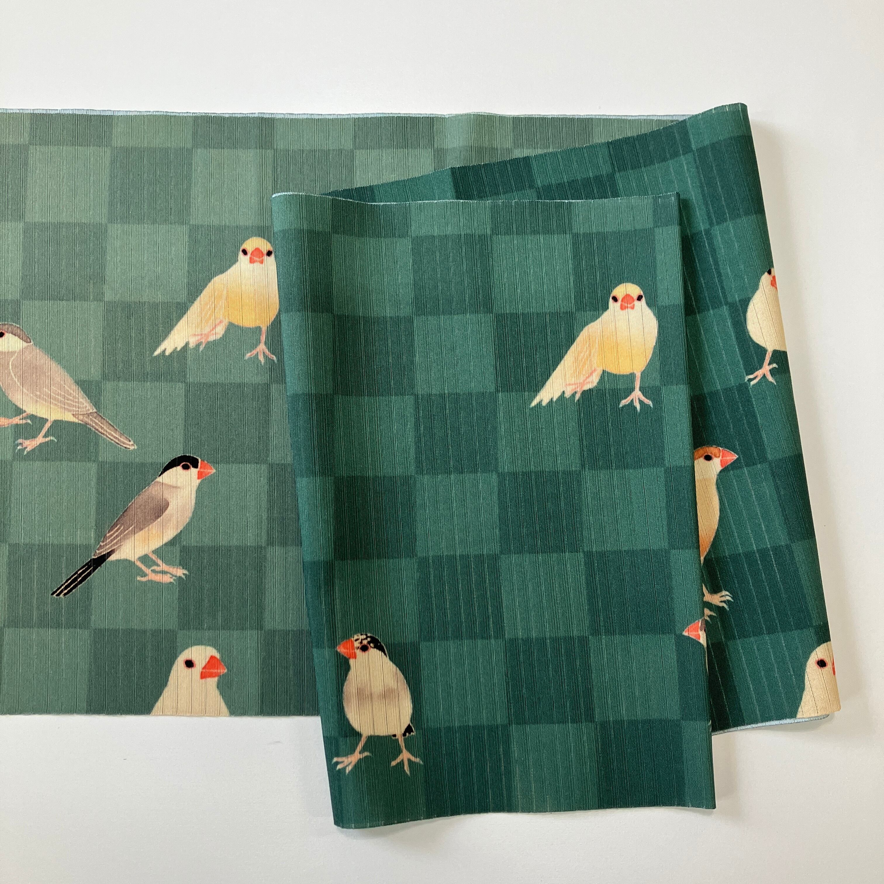 市松地にグリーンのグラデーション。文鳥がなんといっても可愛い!帯揚げとしてならず、ストールとしてもお使いいただけるお品です。