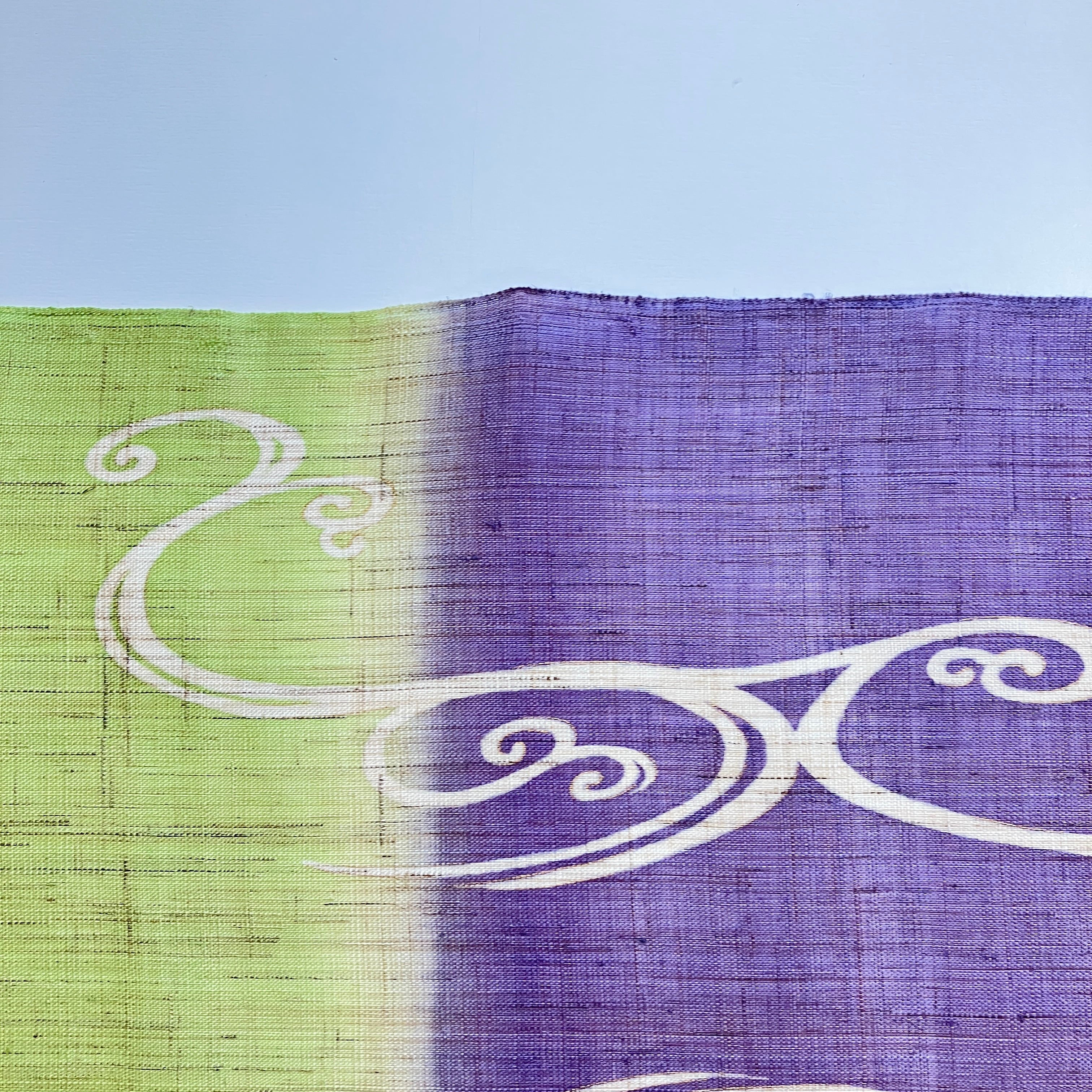 爽やかなツートーンのデザインが特徴で、涼しげな麻素材に波の模様が描かれています。金縁のあしらいが華やかさを引き立て、涼しげな装いのアクセントとしてお使いいただけます。夏の行事やお出かけにもピッタリの一品です。