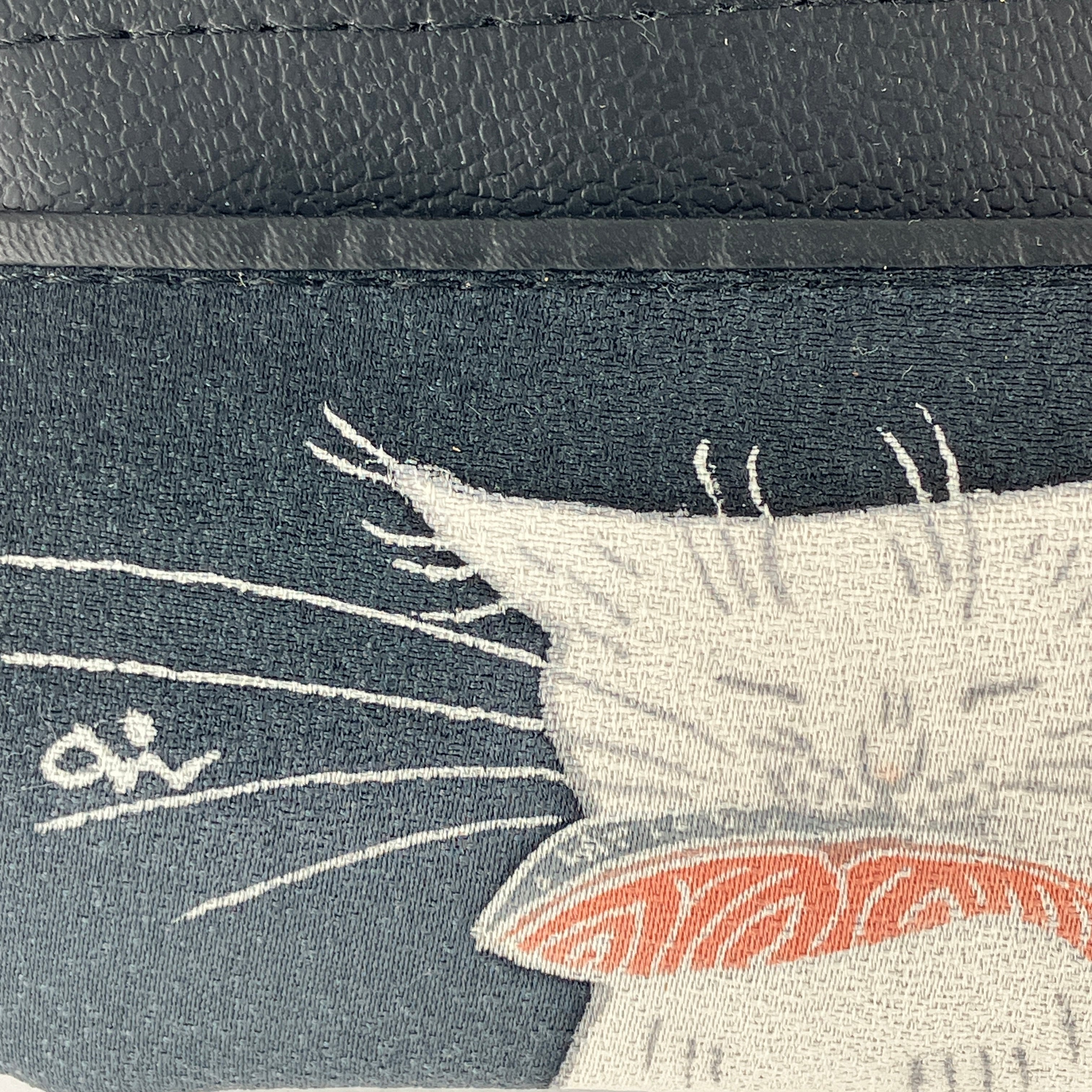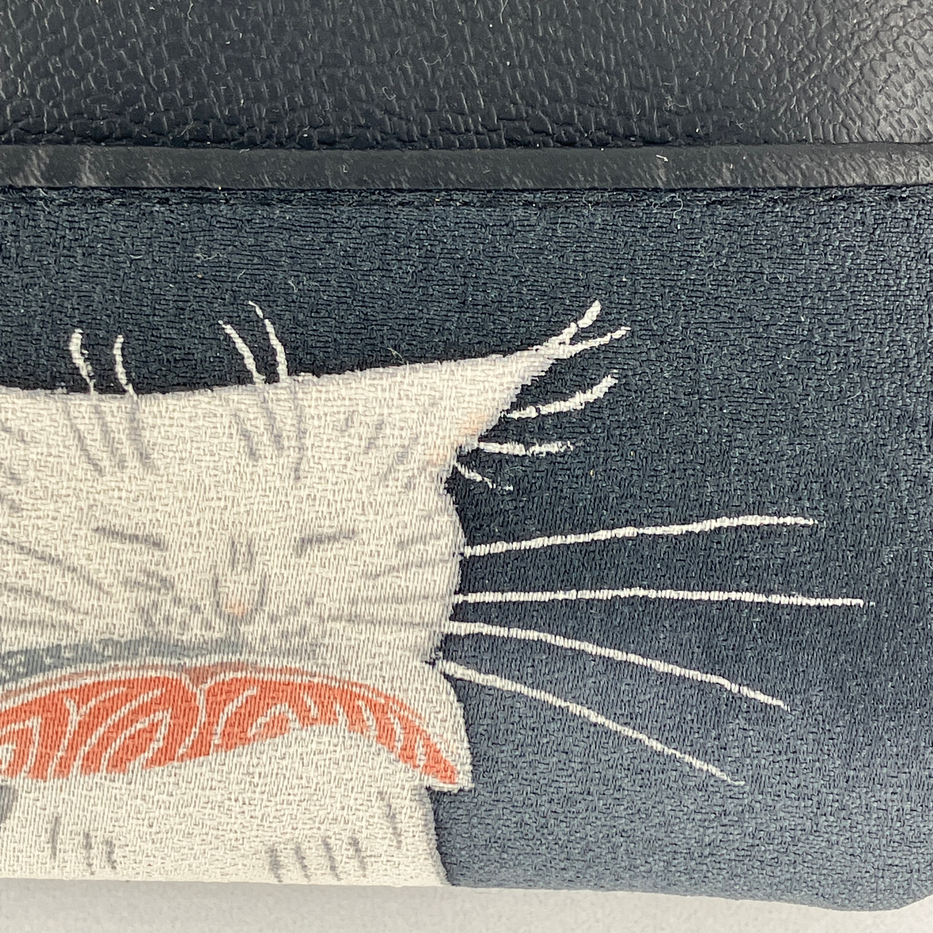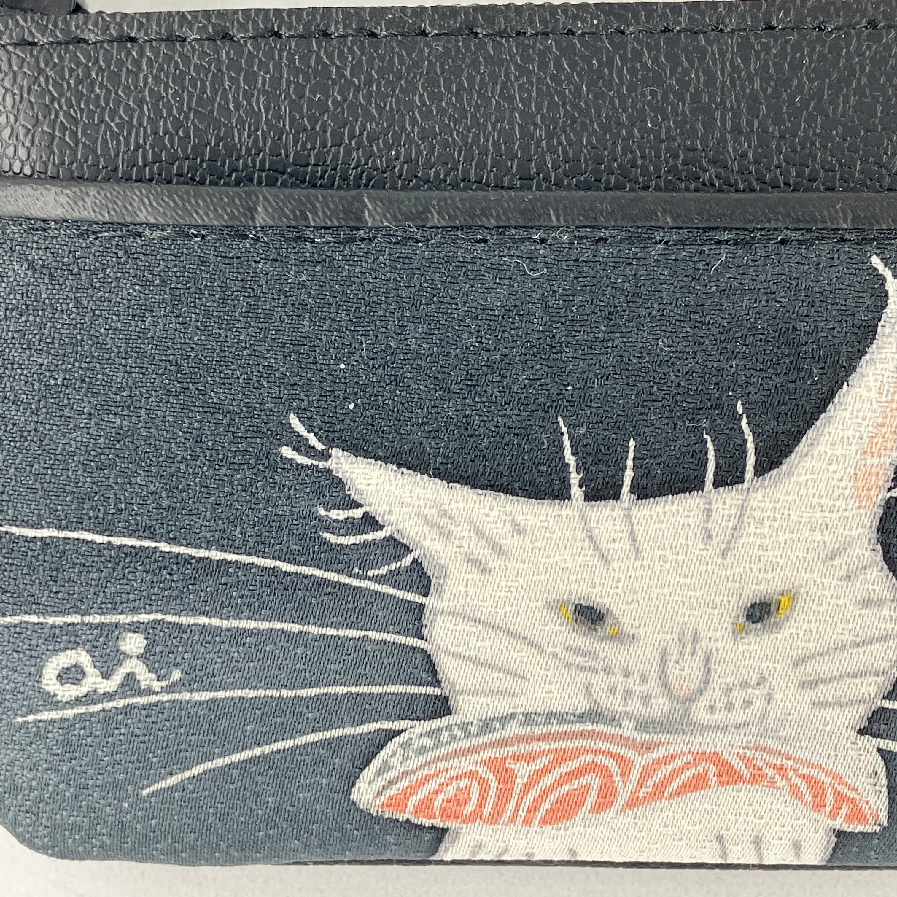 大きなシャケの切り身を咥えた姿がクスッと微笑ましい、ユーモアの溢れる小銭入れです。