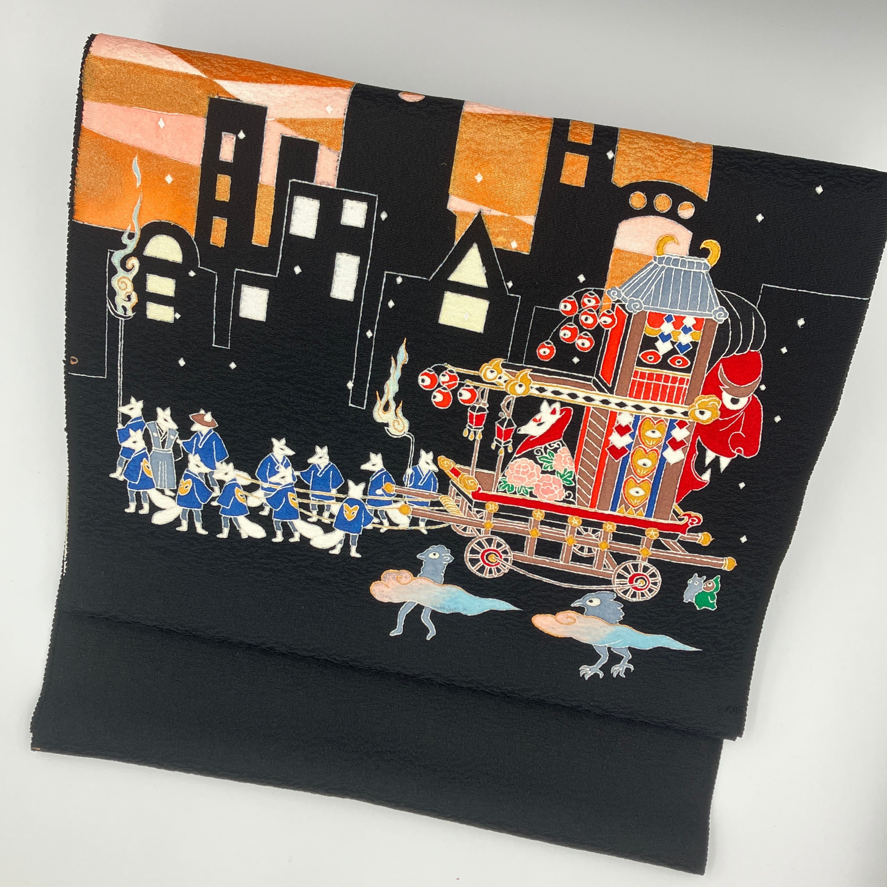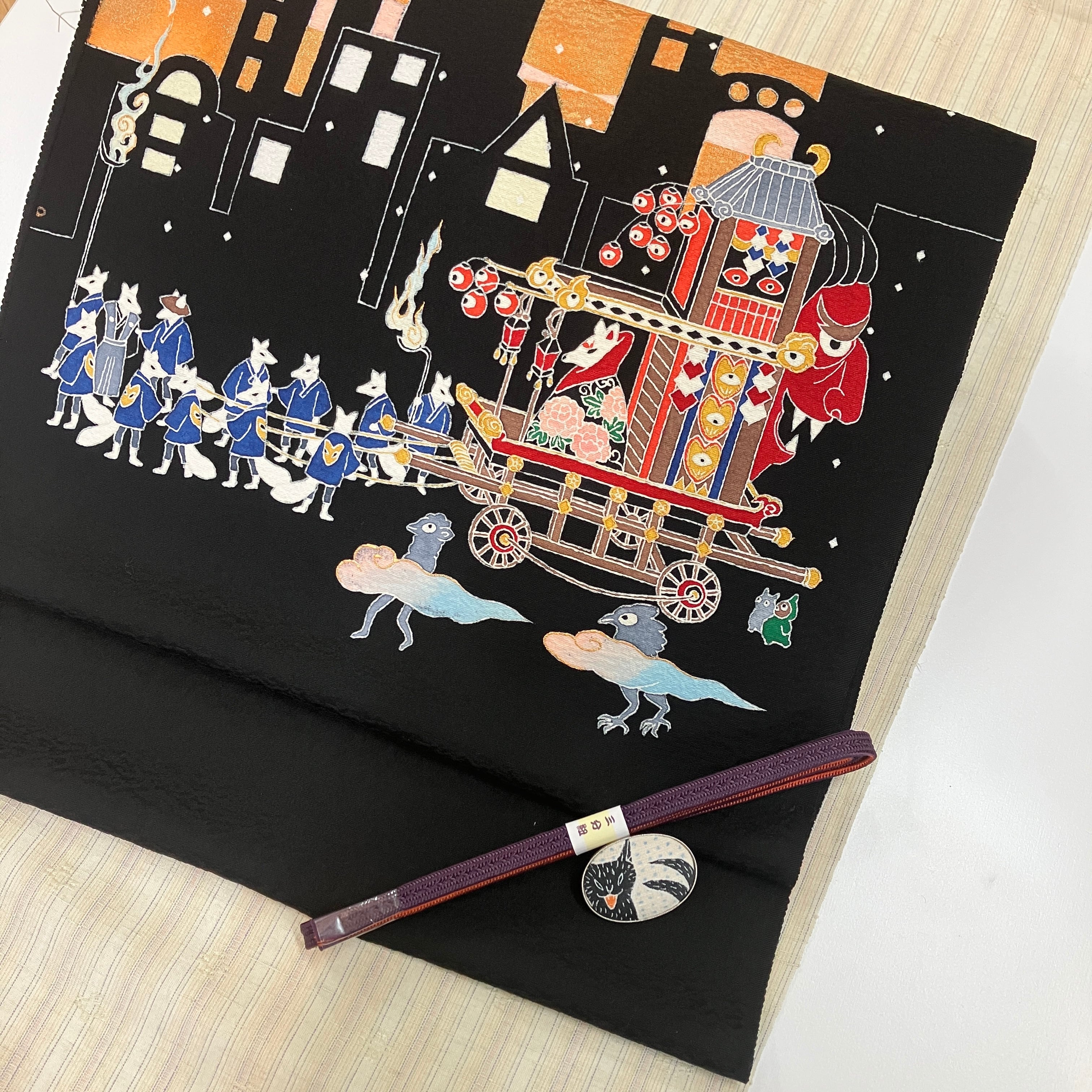 お太鼓柄は、狐たちが鬼を山車に乗せ練り歩くお祭りです。