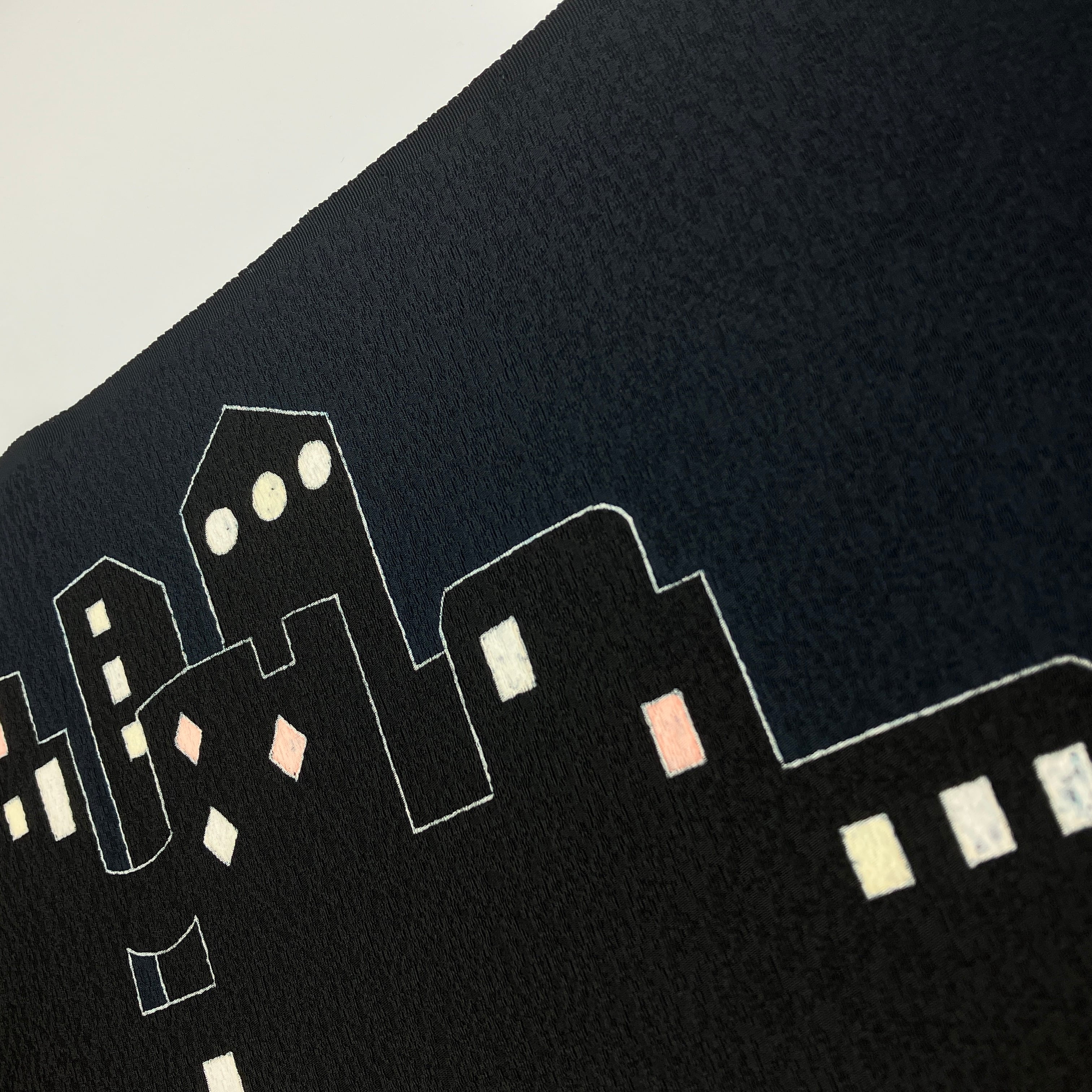 お腹柄には都市のビル群、反対側には雲に乗る鳥のような妖怪たち。