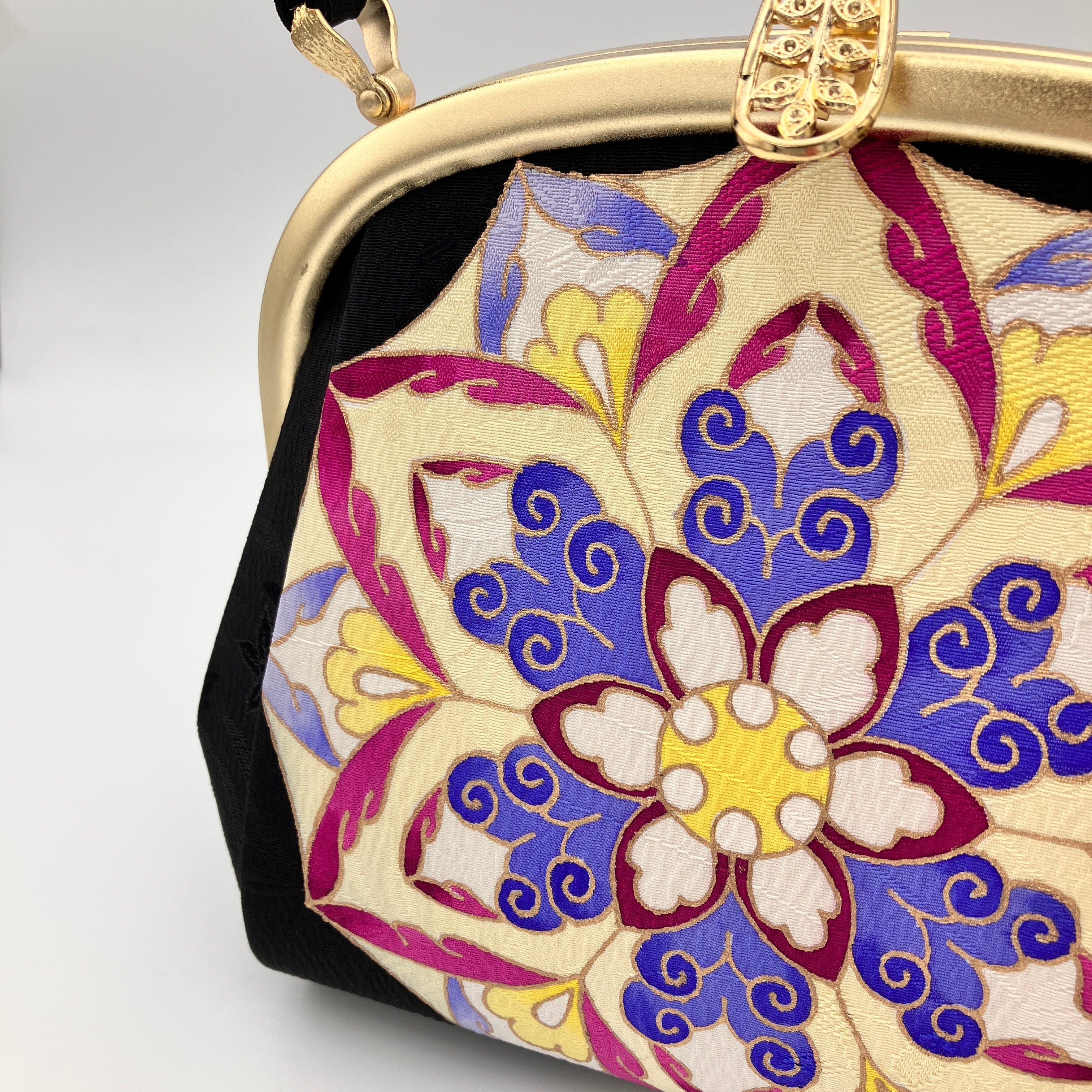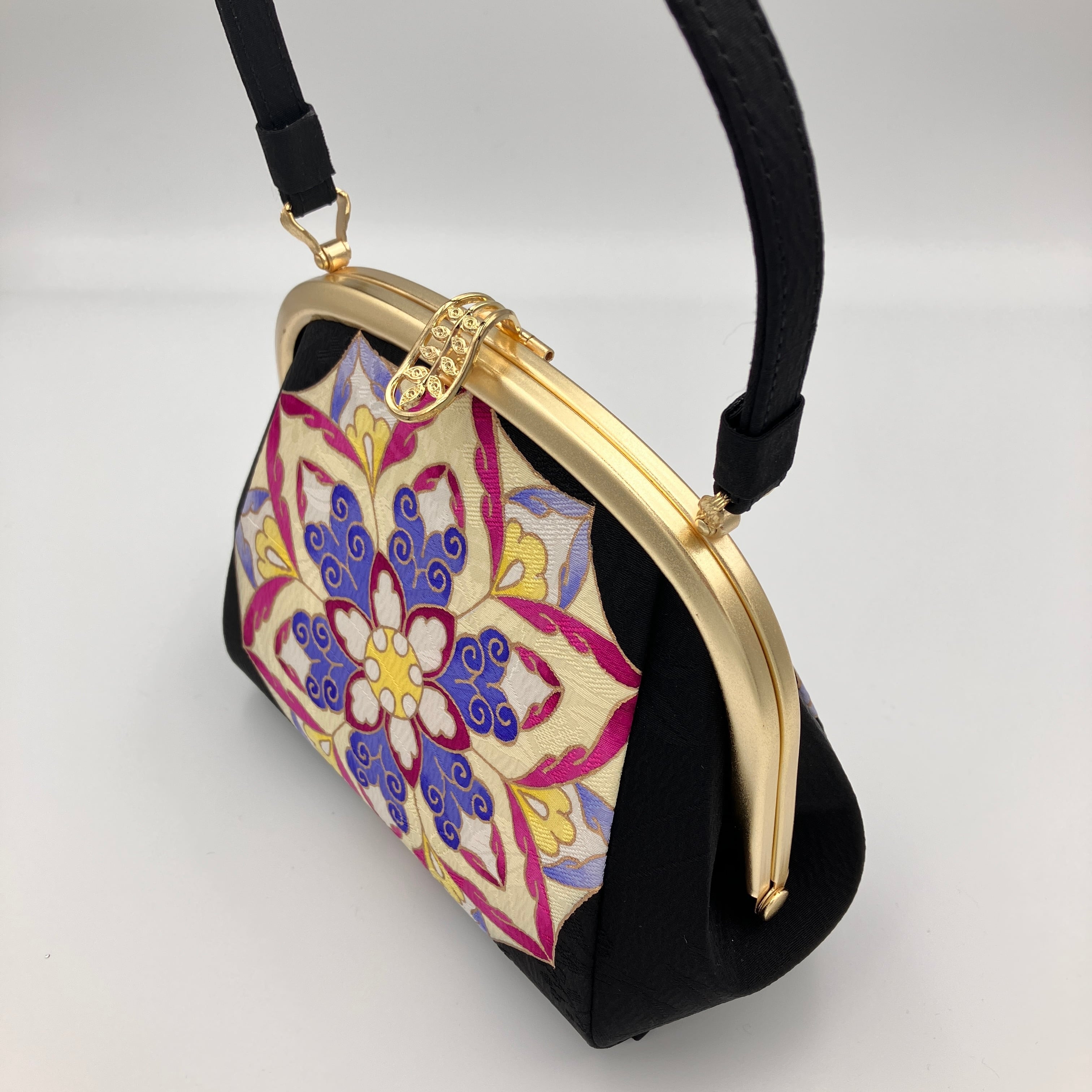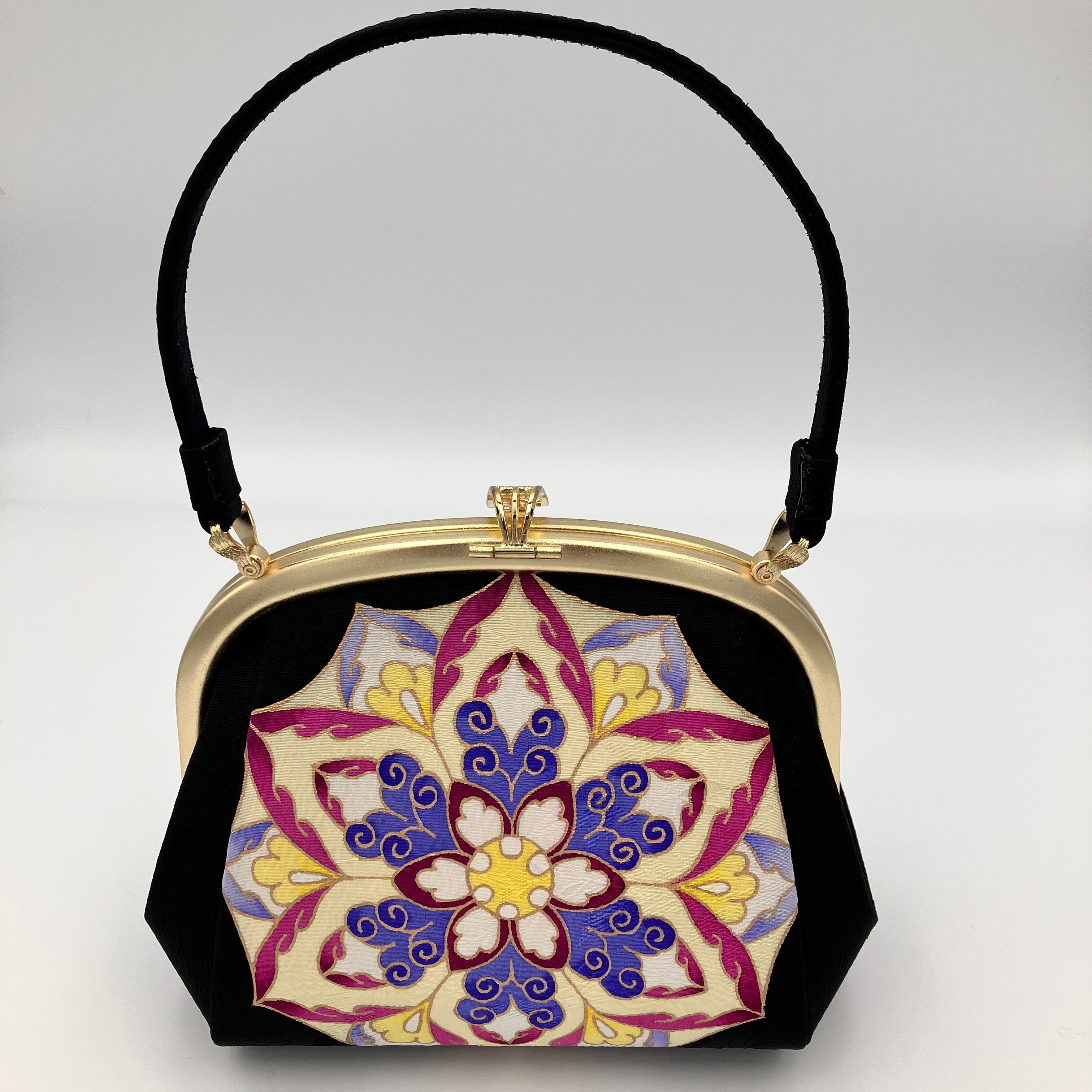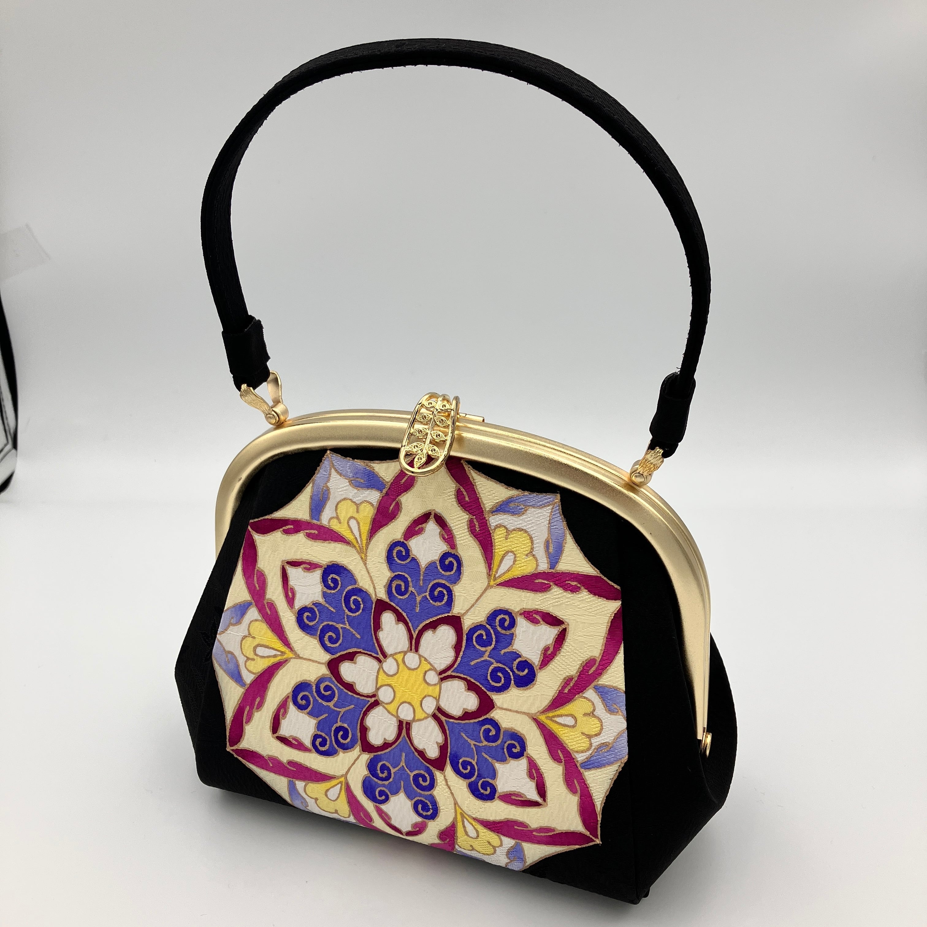 シックな黒地に華やかな華紋が描かれた、特別なシーンに最適なワンハンドルバッグです。