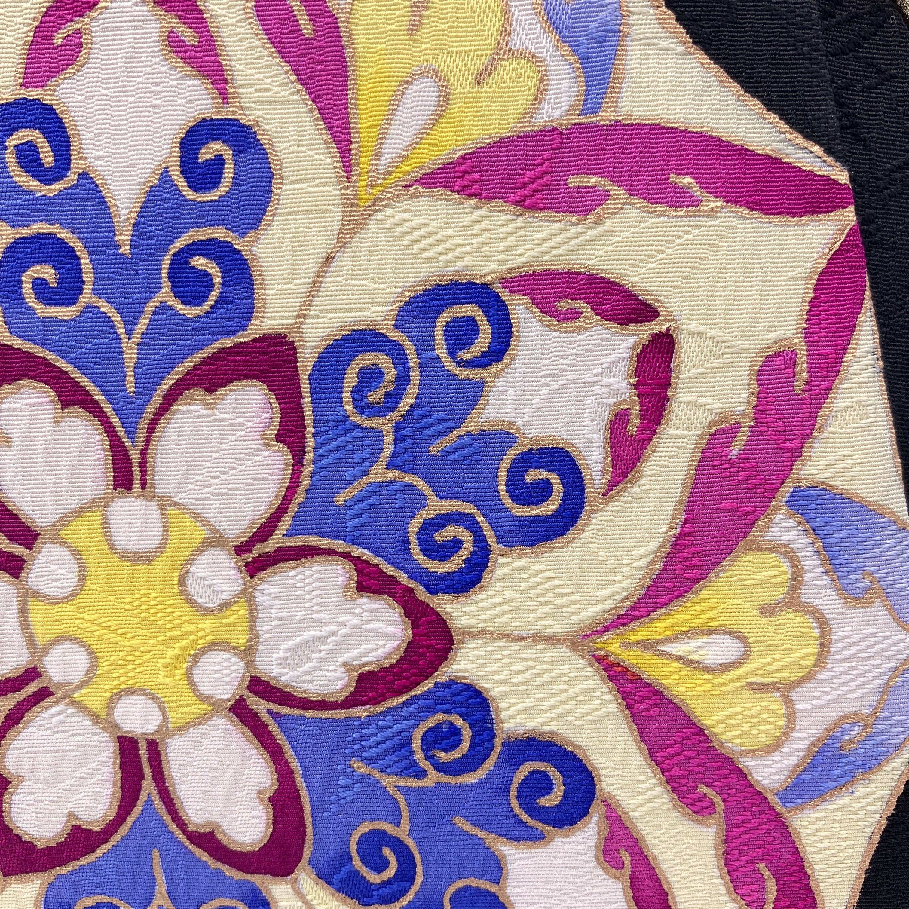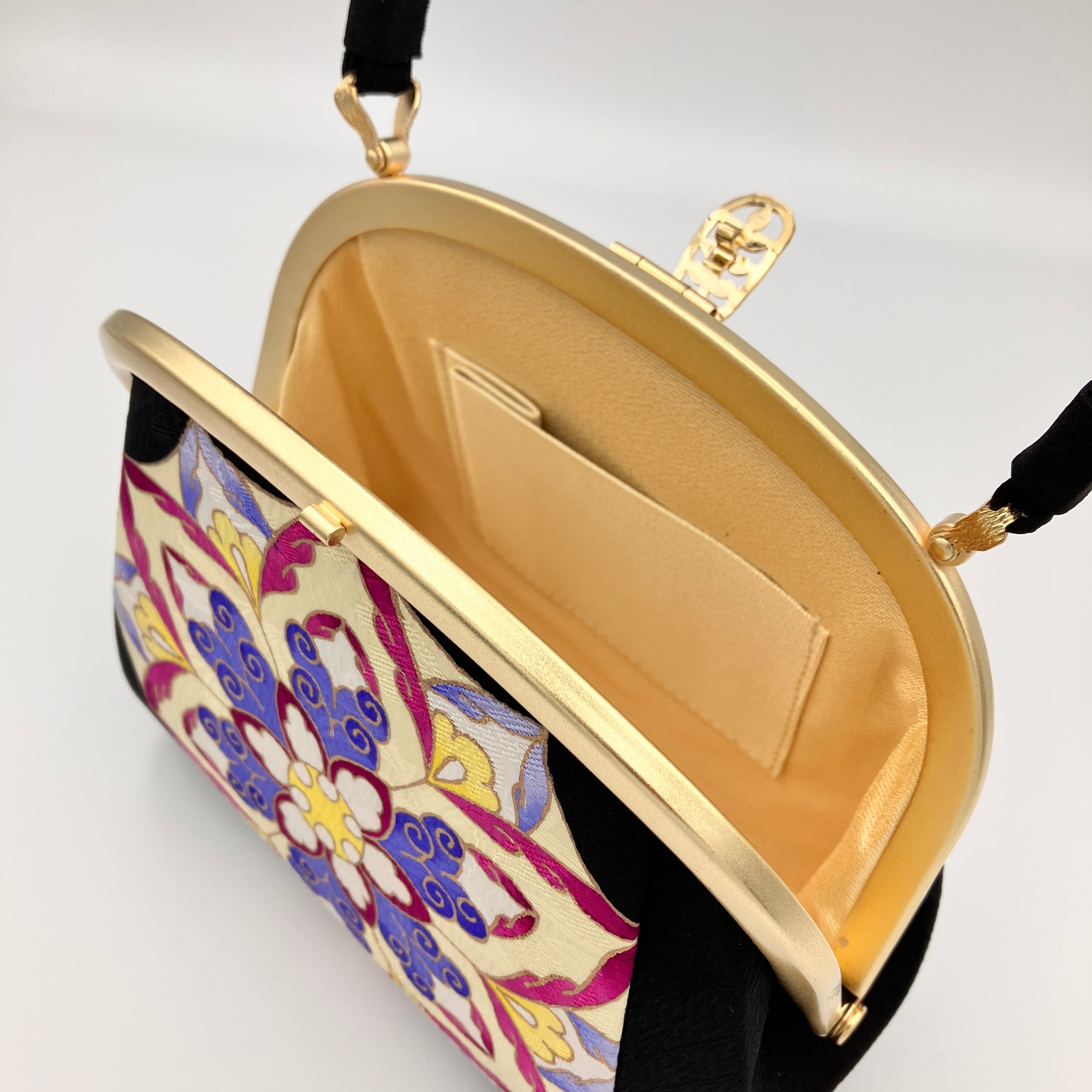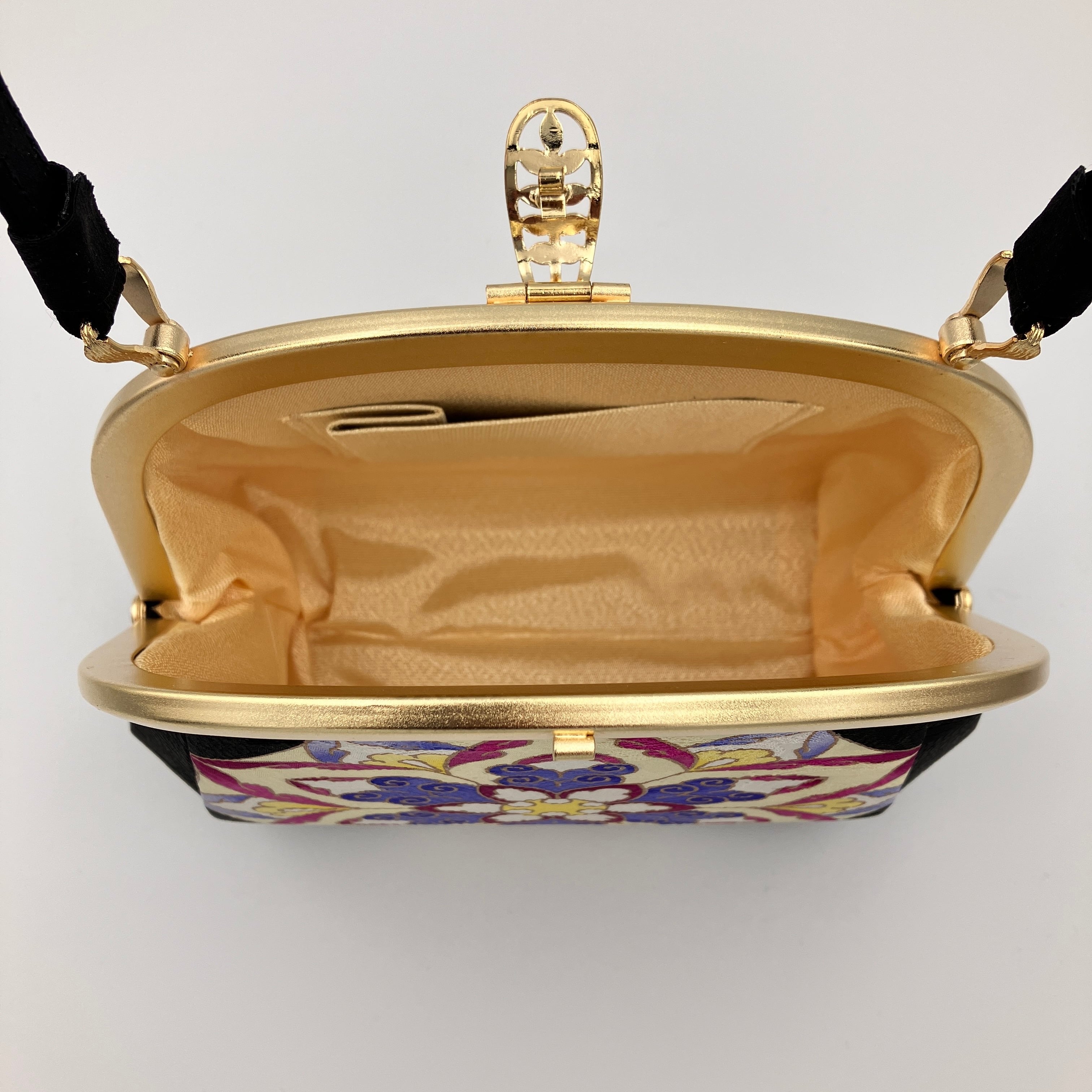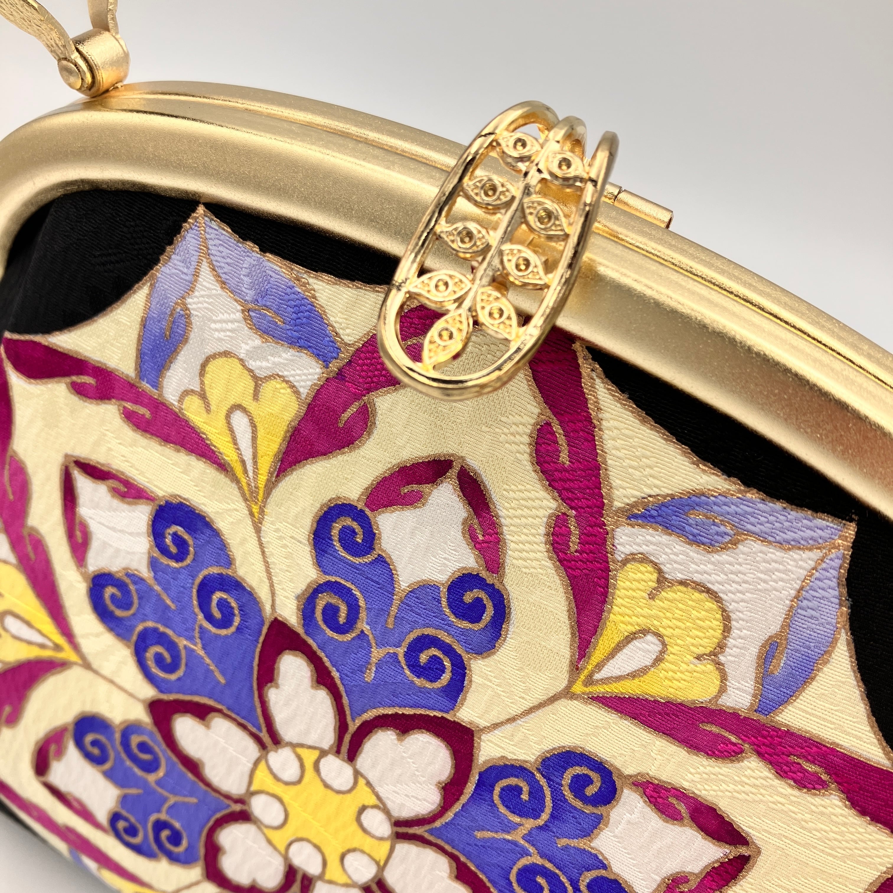 シックな黒地に華やかな華紋が描かれた、特別なシーンに最適なワンハンドルバッグです。