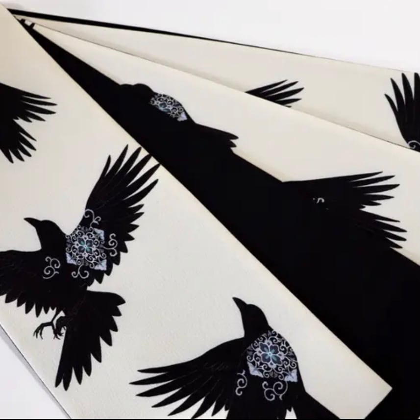 ユキヤオリジナルデザインのヤタガラスを半巾帯にプリントしました。カラスたちの体の紋様は、濡羽色を意匠的に表現したものです。趣味性の高い、格好いい半巾帯です。