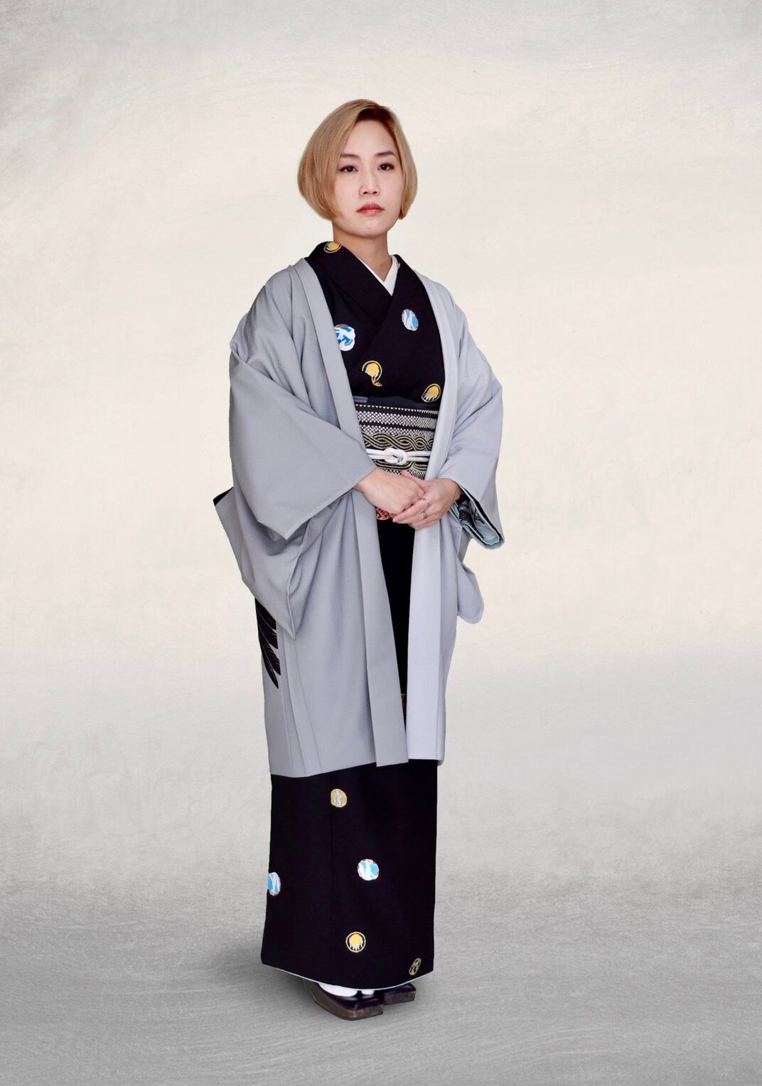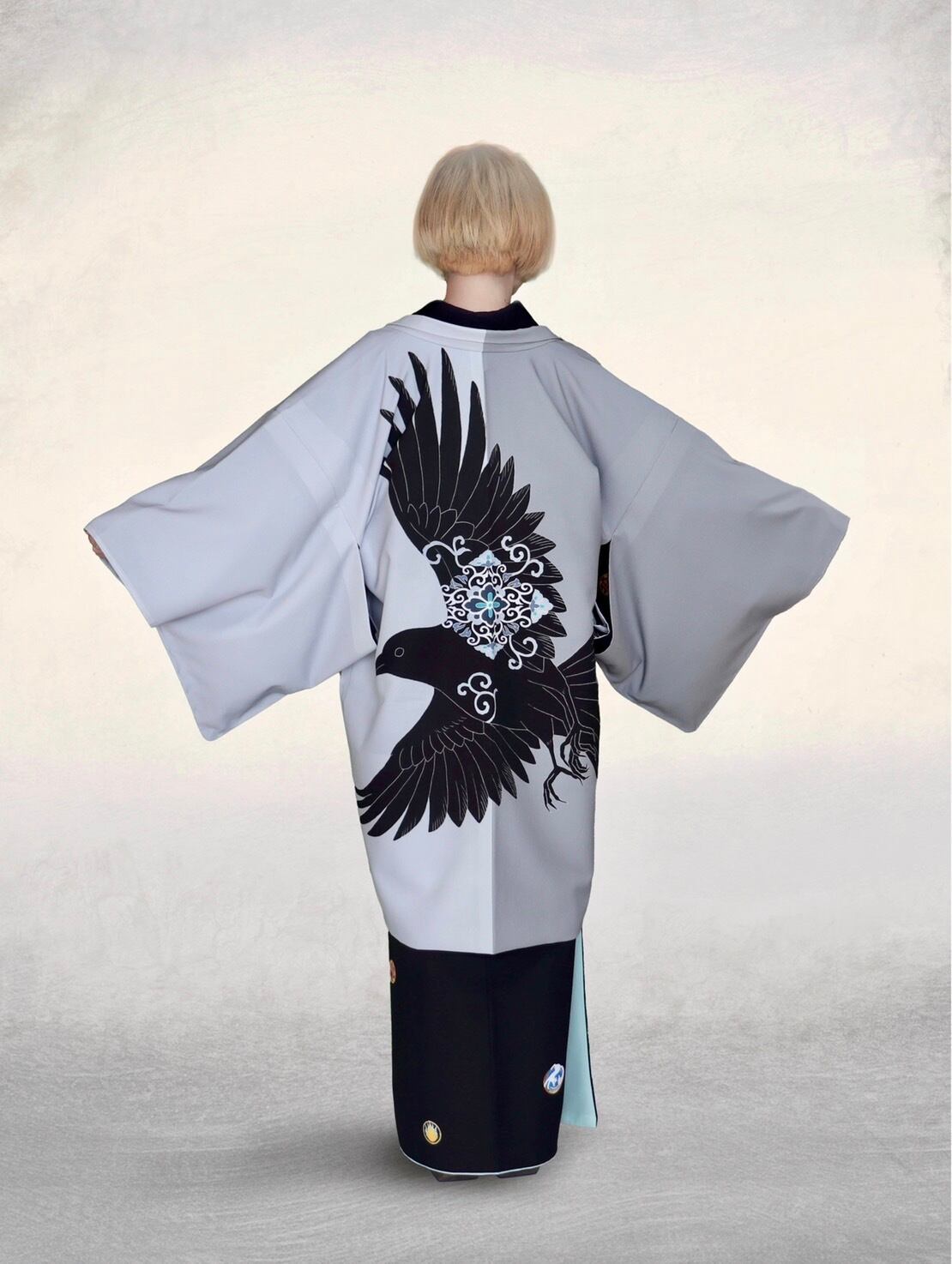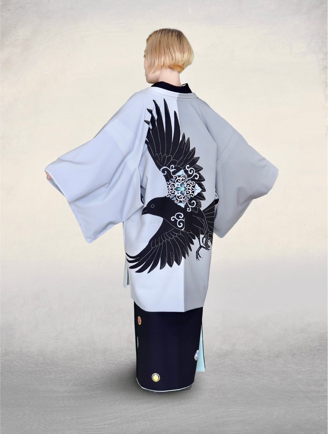 【受注品】some-pri 袷羽織「大ヤタガラス」グレー片身替わり