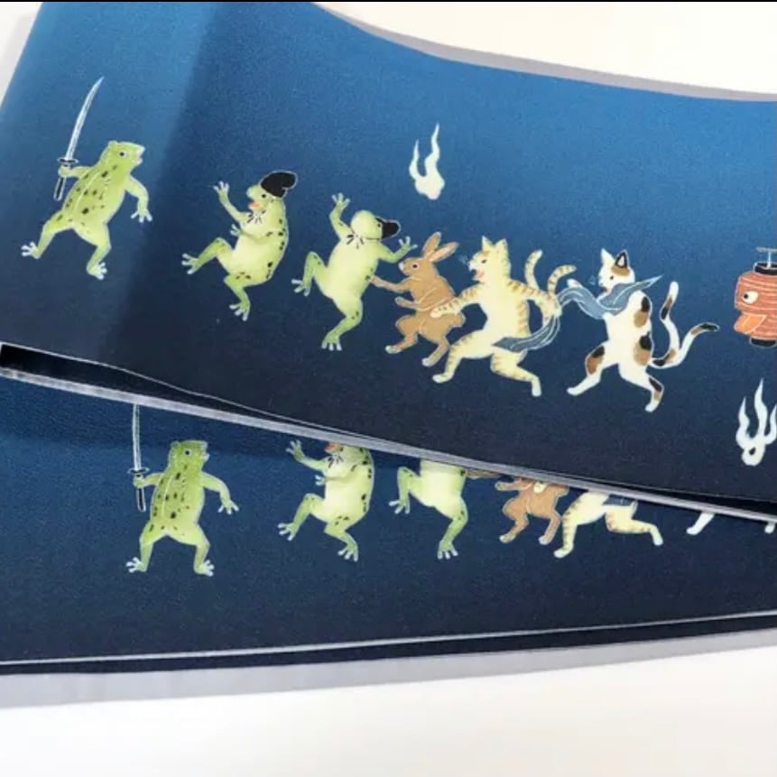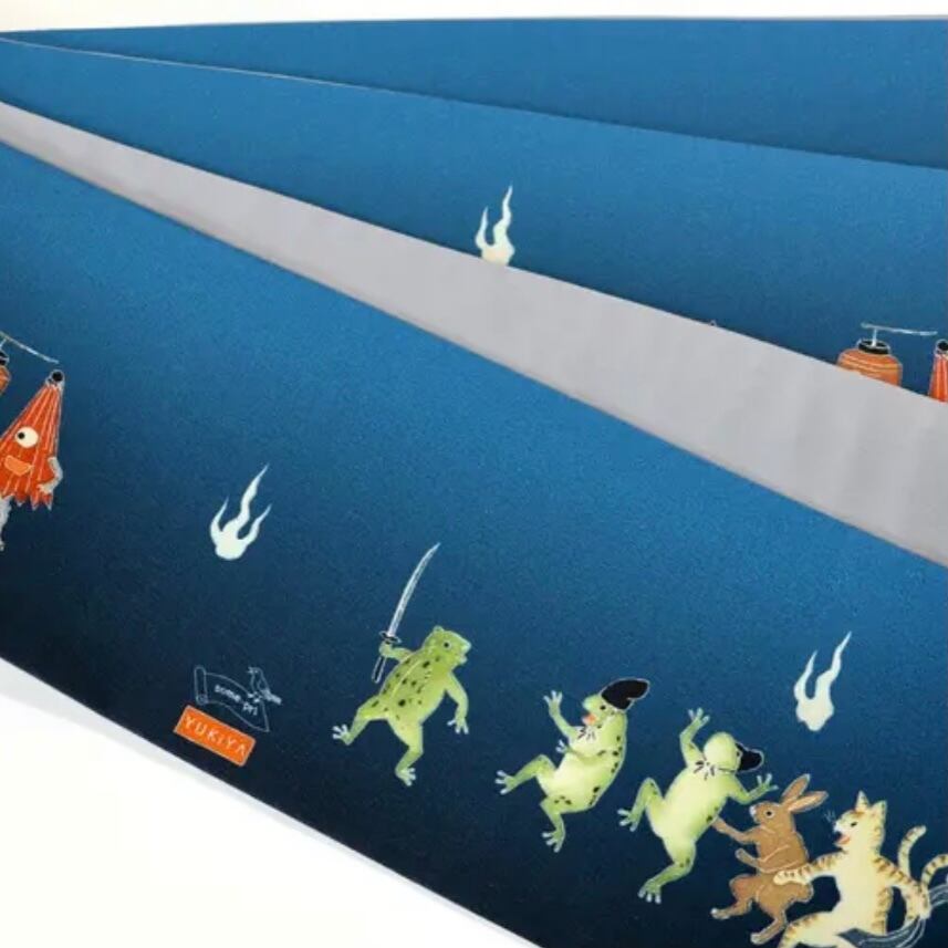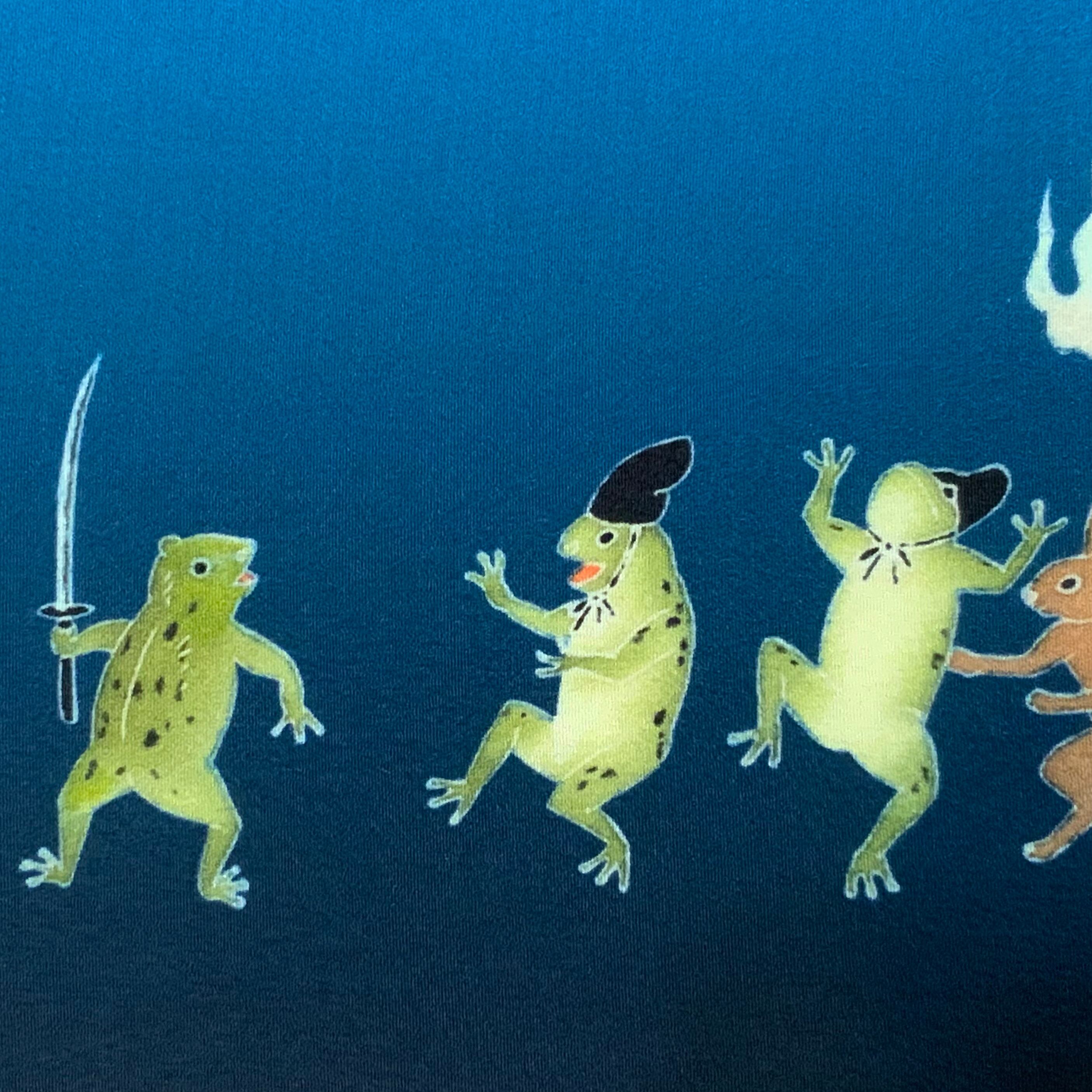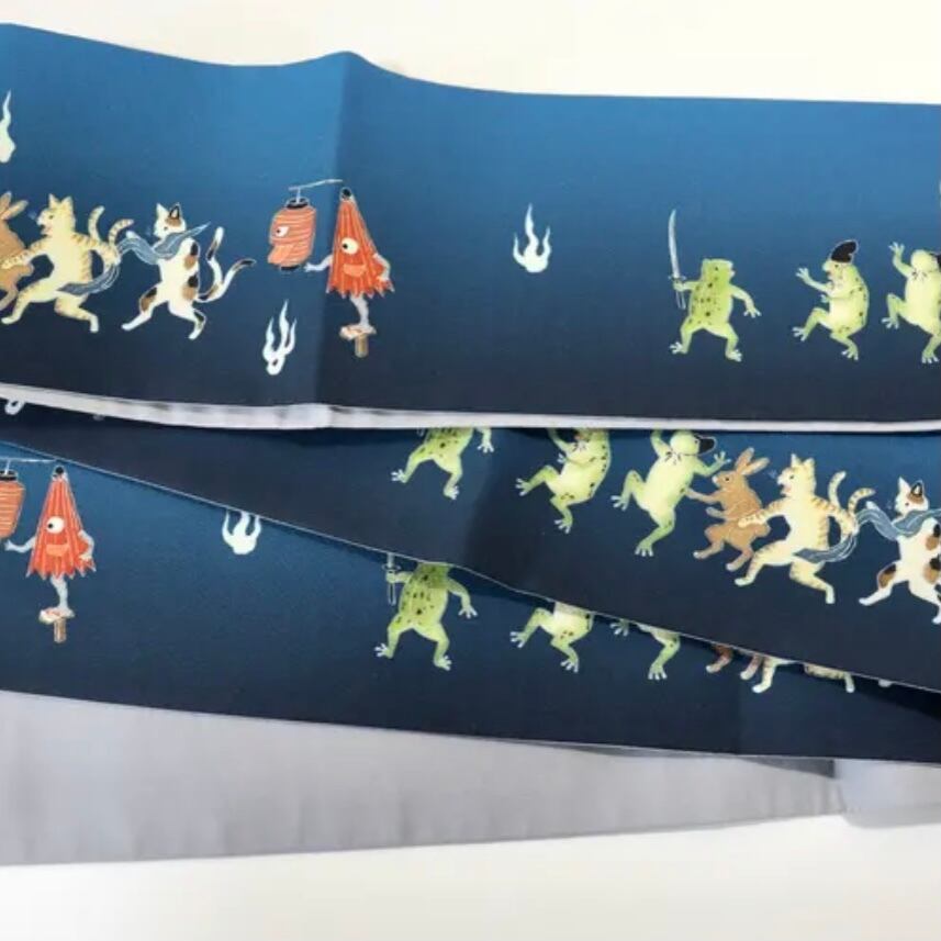 往来でカエルたちが刃物を持ち出す騒ぎを起こしています。野次馬のウサギや妖怪たち。ハロウィンや浴衣のコーディネートにぴったりの半幅帯です。