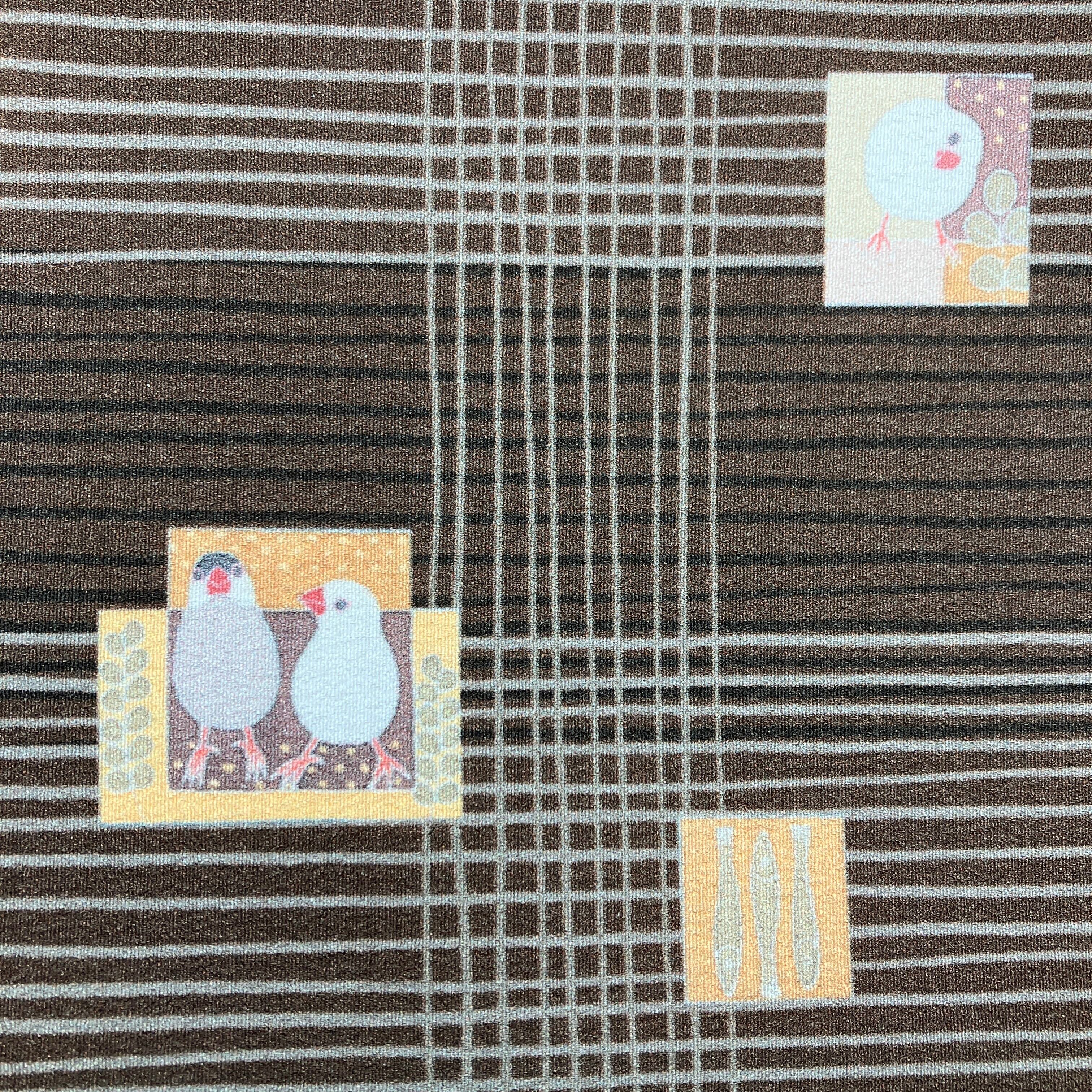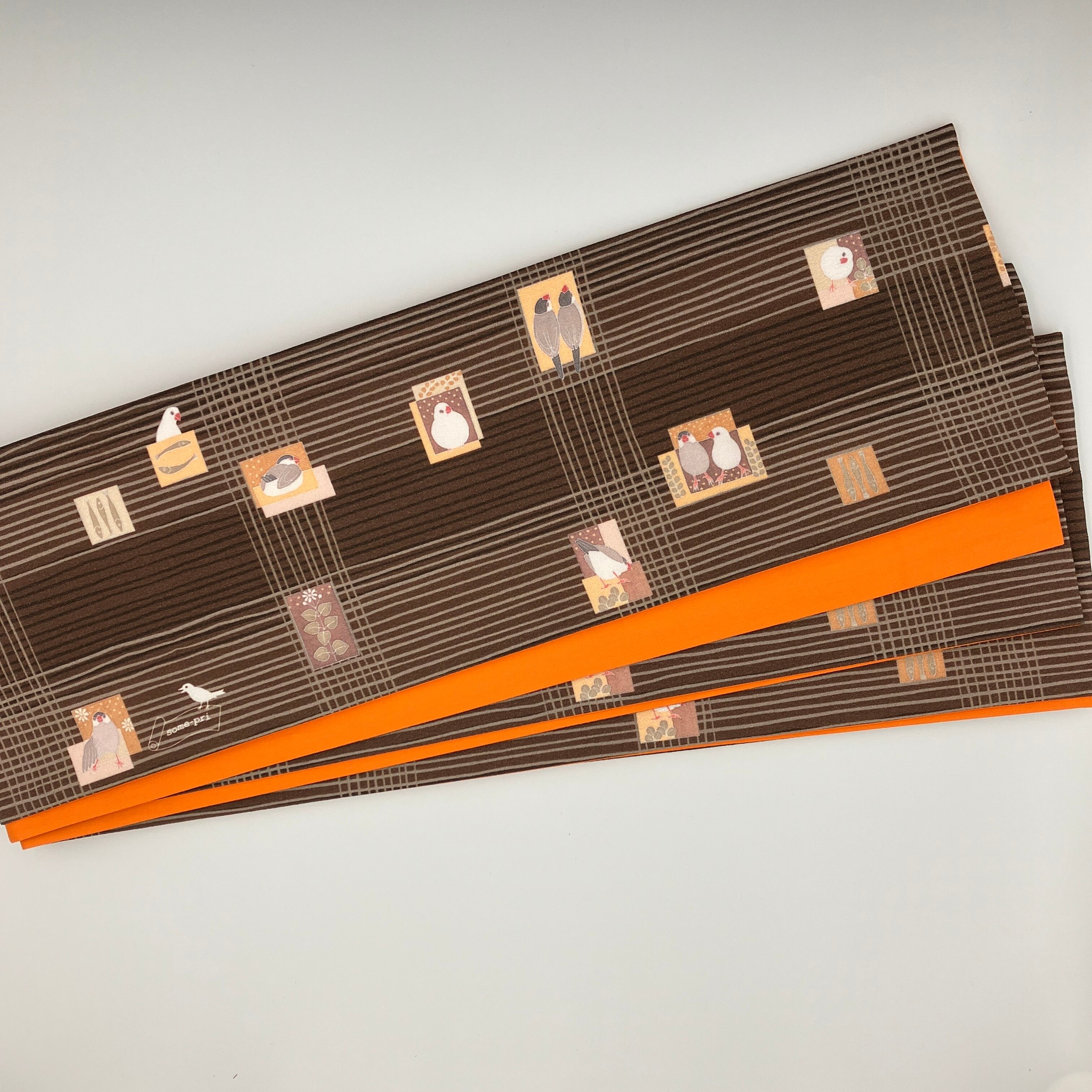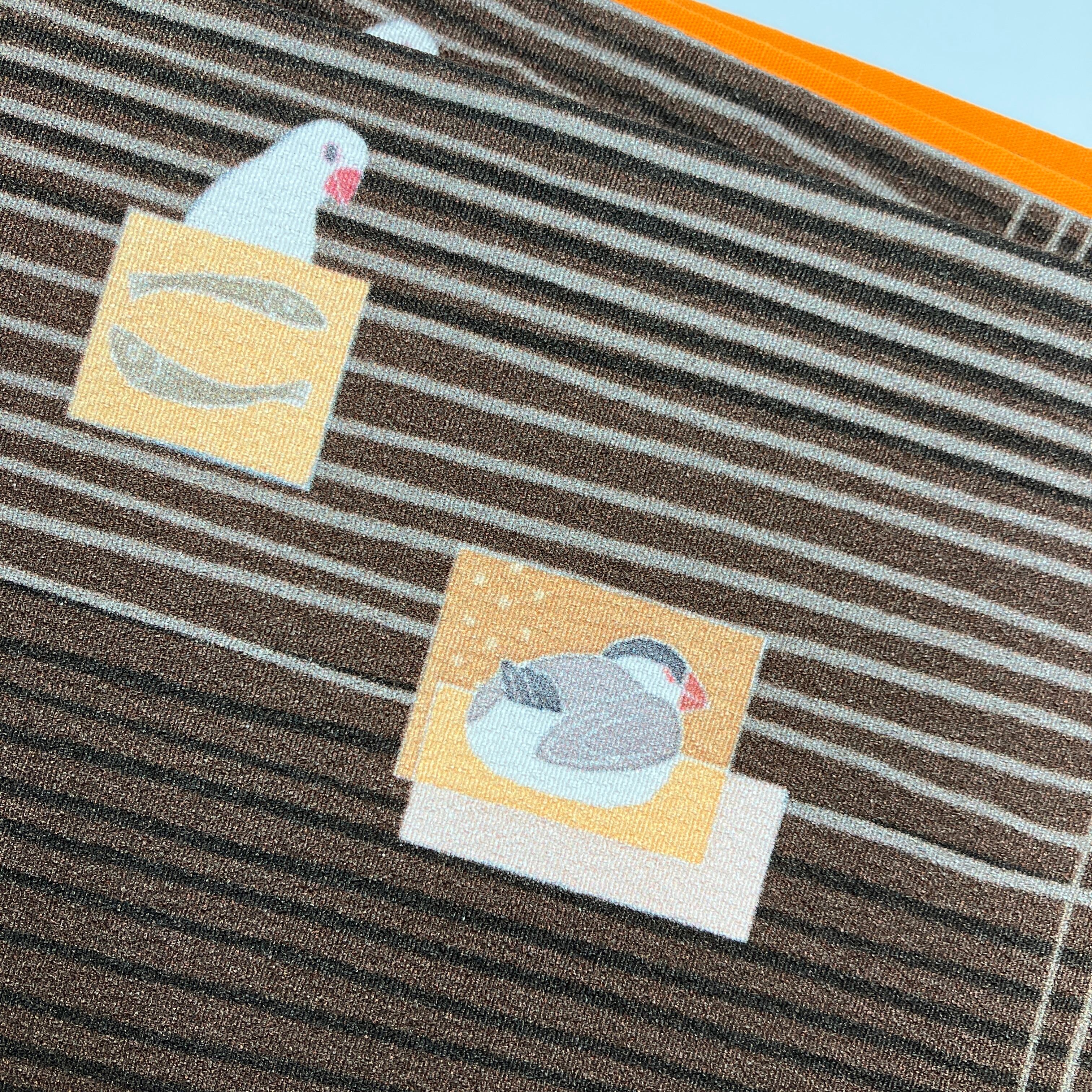 文鳥の可愛さをめいいっぱい詰め込んだデザインです。チョコレート色の地色に。裏地はビビットなオレンジにしました。