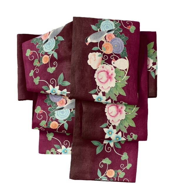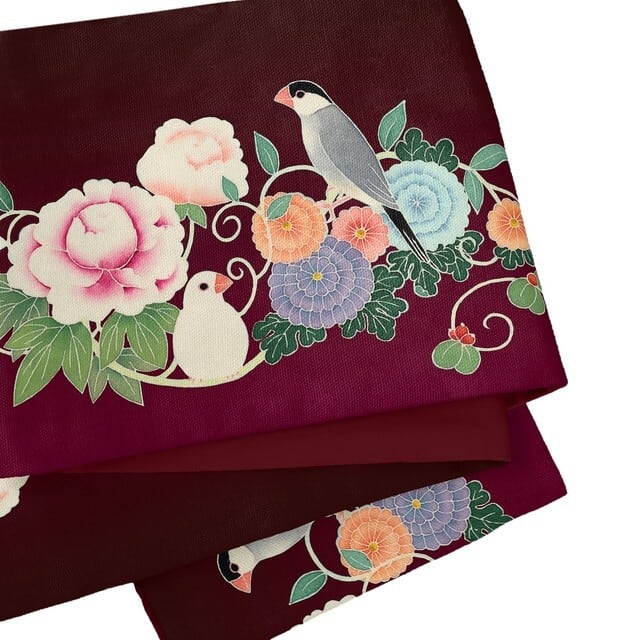some-priの半幅帯「文鳥花飾り」エンジグラデーションは、魅力的なデザインが特徴のアイテムです。エレガントな文鳥のモチーフが散りばめられた華やかな印象を与え、着こなしに奥行きを加えます。シックなエンジ色が、様々なスタイルにマッチし、特別な日のお出かけにもピッタリです。