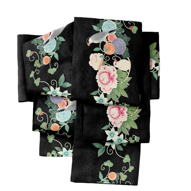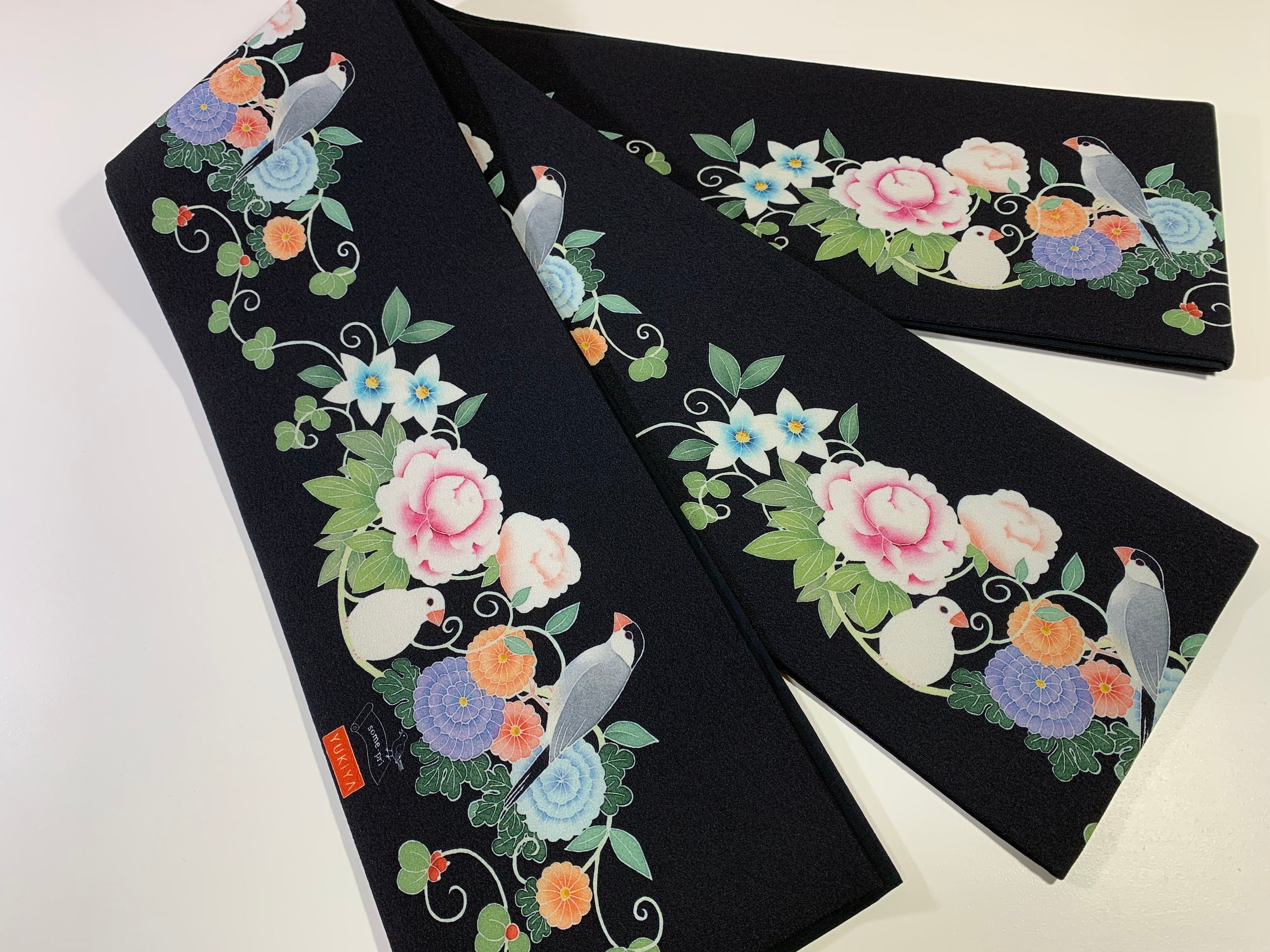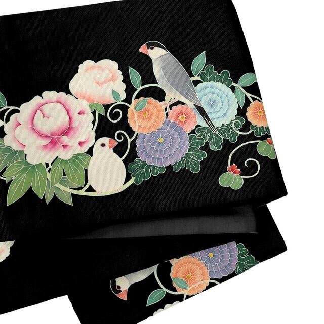 日本の伝統美を感じさせる魅力的なデザインが特徴です。愛らしい文鳥のモチーフが満載で、優雅な印象を与え、コーディネートに華やかさをプラスします。シックな黒色は、さまざまな装いに合わせやすく、特別な日のお出かけや普段使いにもぴったりです。